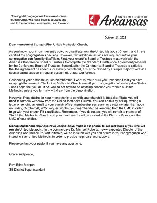 You are aware that members of our congregation voted to disaffiliate from The United Methodist Church at the Church Conference on October 16, 2022. There are several steps that must be taken before this is complete. One of those steps is for members to declare their intent going forward.